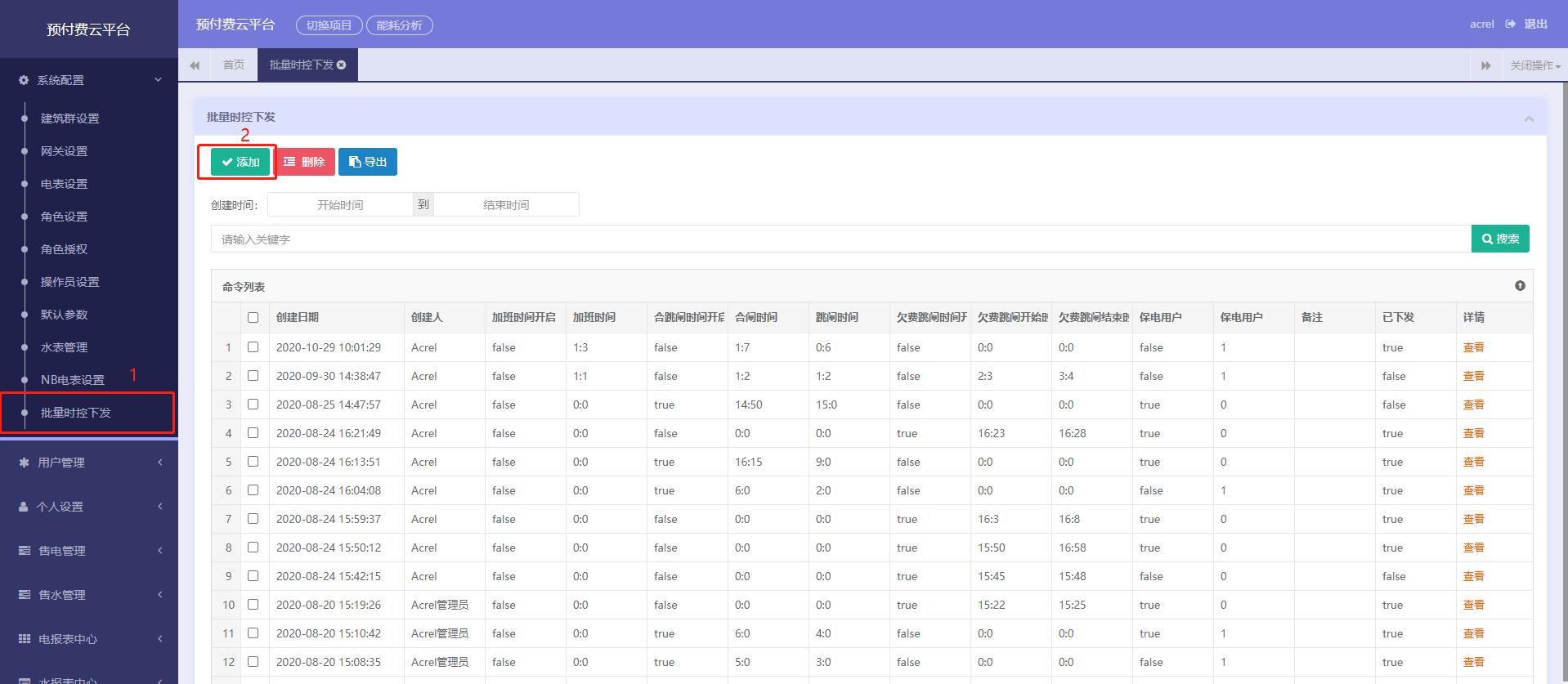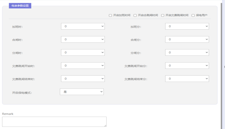 3.3批量下發(fā)時控(定制化)功能:系統(tǒng)可以根據用戶自定義的時間對全部或部分商鋪的用電時間段進行定時控制(分合閘)或欠費跳閘限制(欠費時間段內跳閘),功能界面如下圖所示