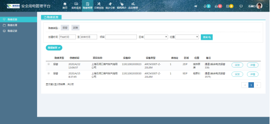 隱患管理包括隱患巡查、隱患處理、和隱患記錄,隱患巡查的目的是為了隱患產(chǎn)生之后下發(fā)工單,所以頁面中只顯示未下發(fā)工單的隱患記錄,包括隱患類型、創(chuàng)建時間、項(xiàng)目名稱、設(shè)備ID、位置、故障原因等記錄,并且可以通過“派發(fā)”按鈕,派發(fā)工作任務(wù);隱患處理即工單處理,表示工單需要當(dāng)前登錄用戶確認(rèn),形成隱患處理的閉環(huán),頁面中只顯示發(fā)給當(dāng)前登錄用戶且未處理的工單記錄;隱患記錄顯示所有的隱患記錄,可以按照隱患類型(報警、故障)、狀態(tài)(未派發(fā)、已派發(fā)未處理、已派發(fā)已處理)分類顯示,支持按照創(chuàng)建時間、項(xiàng)目名稱、所在區(qū)域等條件來對隱患記錄信息進(jìn)行針對性的查詢操作。