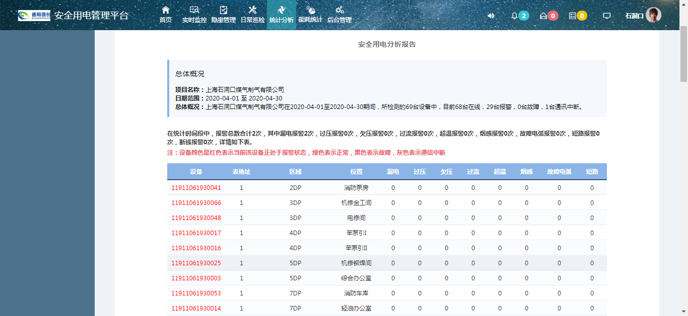 2020年3月,安全用電管理平臺為上海某煤氣制氣有限公司在機(jī)修變電所、液化氣儲運(yùn)站變電所和排水泵房配電室的饋線回路安裝漏電火災(zāi)探測器ACRM300T-Z-2G(監(jiān)測1路剩余電流,4路線纜溫度),并通過2G網(wǎng)絡(luò)至安全用電管理平臺,對用電設(shè)備和電氣線路進(jìn)行24小時監(jiān)測,智能偵測各用戶電氣火災(zāi)隱患點(diǎn),智能調(diào)度技術(shù)人員快速現(xiàn)場排除,遏制電氣火災(zāi)發(fā)生,確保企業(yè)生命財產(chǎn)安全。 1)根據(jù)上海某煤氣制氣有限公司實(shí)際要求,其本地?zé)o專業(yè)服務(wù)器運(yùn)維人員,將安全用電數(shù)據(jù)托管至安科瑞服務(wù)器內(nèi)。由本地配電運(yùn)維人員通過手機(jī)APP,24小時監(jiān)視各探測點(diǎn)的剩余電流、溫度、電壓、電流、諧波、功率、電能及其他設(shè)備狀態(tài)等信息。有助于現(xiàn)場及時發(fā)現(xiàn)的隱患,為企業(yè)老舊線纜的及時檢測及電器使用不規(guī)范,保護(hù)與負(fù)載不匹配、負(fù)載隨意添加和不規(guī)范的分路引線。