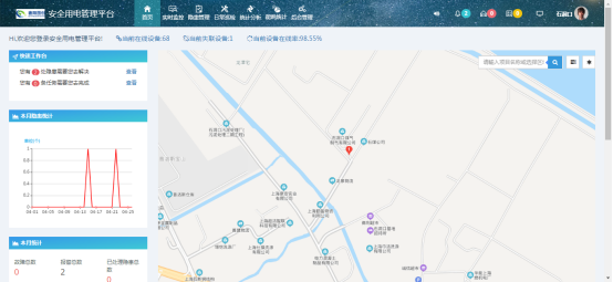 5.2 平臺首頁 通過平臺首頁可以快速瀏覽隱患巡查界面或隱患處理界面、本月隱患、故障統(tǒng)計(jì)以及項(xiàng)目信息地圖導(dǎo)航,智能調(diào)度技術(shù)人員可以及時通過曲線、地圖等各種方式查看隱患數(shù)量、隱患位置、隱患發(fā)生頻率以及任務(wù)的接收、下發(fā)情況,并可以通過項(xiàng)目列表、地圖快速查定位需要查詢的項(xiàng)目情況。