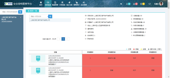 5.3 實(shí)時監(jiān)控 通過實(shí)時監(jiān)控界面,除了可以實(shí)時顯示項(xiàng)目所屬客戶、地址、建筑面積、消防設(shè)施、安全責(zé)任人、聯(lián)系電話、設(shè)備數(shù)量、探測器數(shù)量等信息,還以更醒目的方式顯示了未處理報警和未處理故障信息,下屬設(shè)備和探測器,并可以查看各設(shè)備以及探測器基本信息、開關(guān)操作、數(shù)據(jù)監(jiān)控、實(shí)時數(shù)據(jù)、參數(shù)設(shè)置、歷史信息和報警信息等。