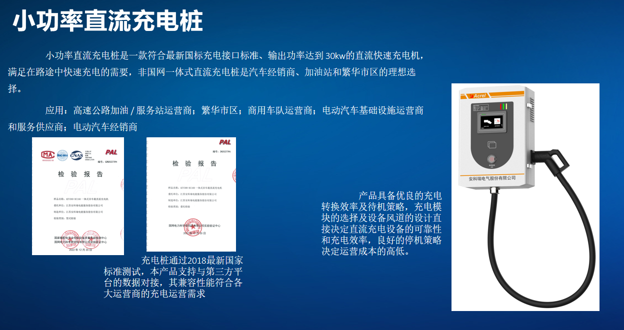 小功率直流充電樁是一款符合最新國(guó)標(biāo)充電接口標(biāo)準(zhǔn)、輸出功率達(dá)到 30kw的直流快速充電機(jī),滿足在路途中快速充電的需要,非國(guó)網(wǎng)一體式直流充電樁是汽車經(jīng)銷商、加油站和繁華市區(qū)的理想選擇。